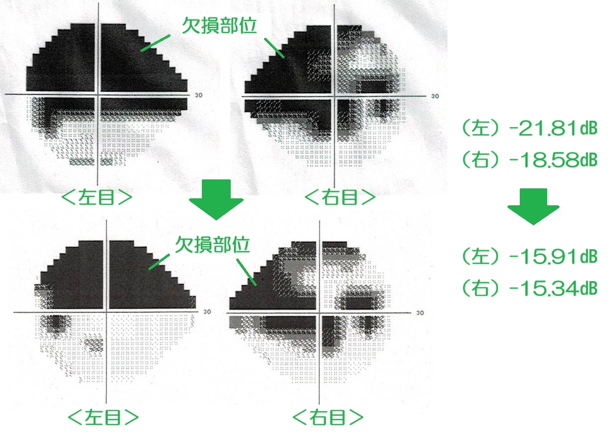 これは一度の比較ですので、今後どう変化していくかを冷静に観察する必要がありますが、緑内障末期の方だと思えば結果は悪くありません。